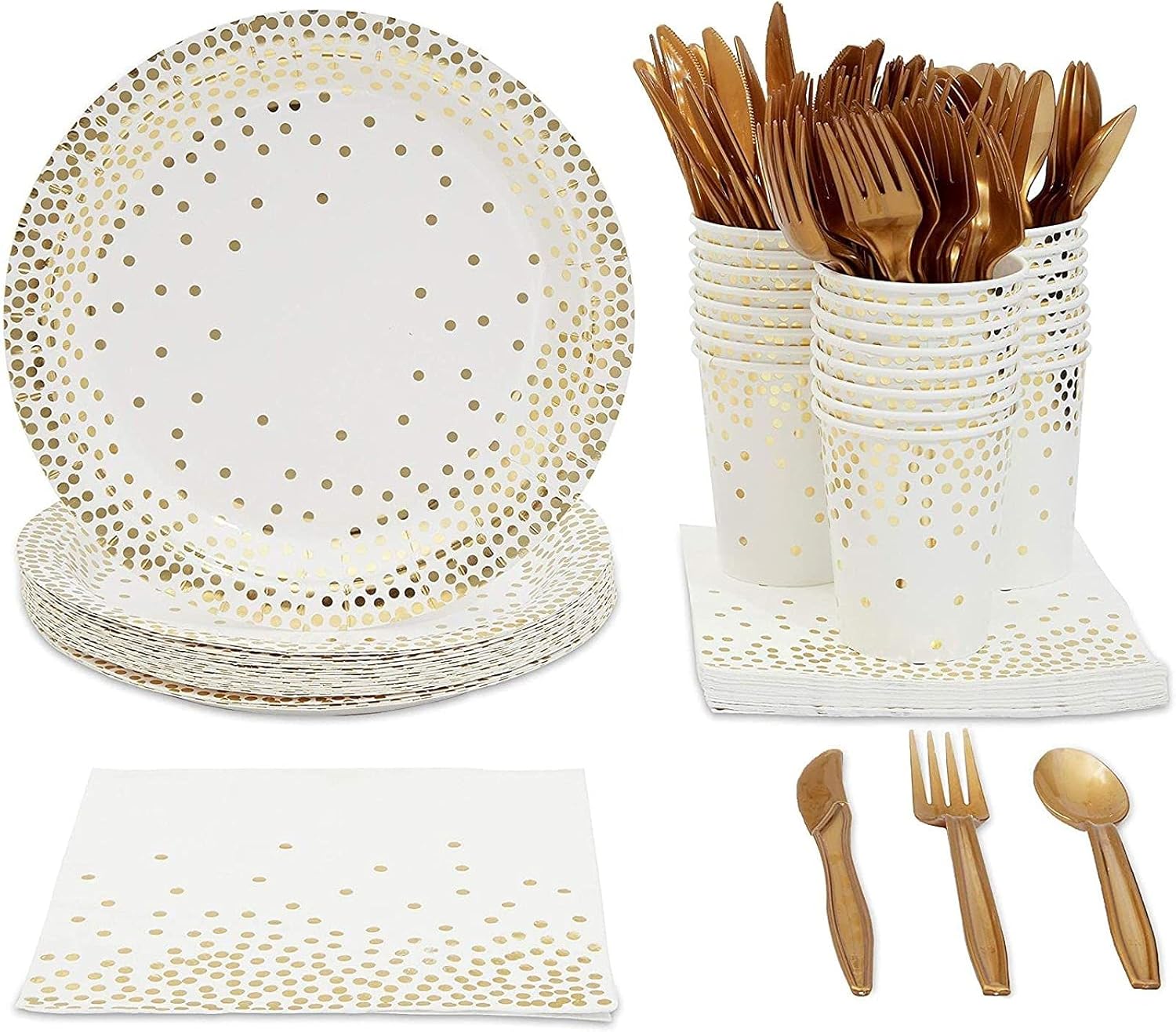 - GOLD FOIL POLKA DOT PARTY SUPPLIES: Paper plates, napkins and cups feature a beautifully modern gold foil polka dot design on a white background; create a perfectly coordinated theme for birthdays, baby showers, weddings, rehearsal dinners, anniversaries, New Year's Eve, graduations and classroom parties